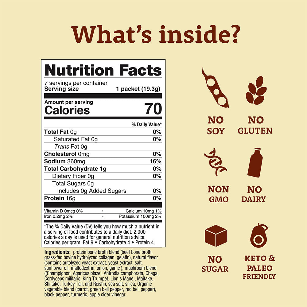 Ingredients: Protein bone broth blend (beef bone broth, bovine hydrolyzed collagen, gelatin), natural flavor (contains autolyzed yeast extract, salt, sunflower oil, maltodextrin, onion powder, garlic powder), ramen seasoning (sugar, spices), sea salt, silica, organic vegetable blend (carrot, green bell pepper, red bell pepper), black pepper, Reishi mushroom, apple cider vinegar.