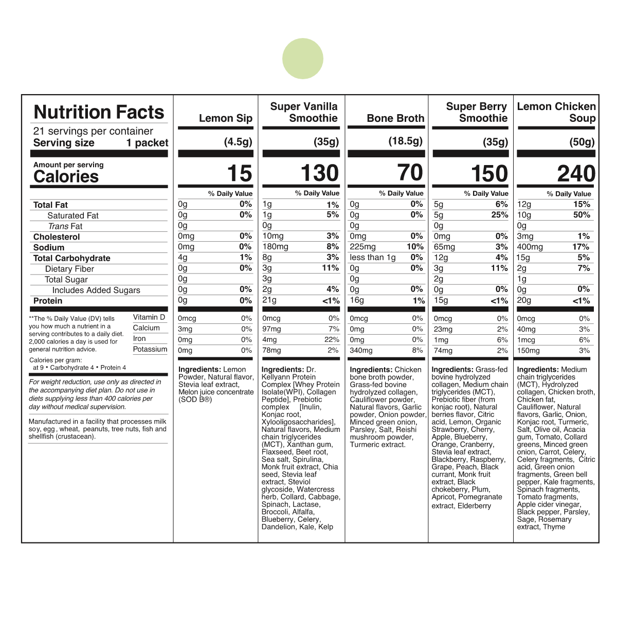 The cleanse kit includes Lemon Sips for hydration and gentle detox, Super Smoothies for protein and essential nutrients, Bone Broths to support gut health, Super Berry Smoothies packed with antioxidants, and Lemon Chicken Soups for warm, nourishing evening meals—providing a complete, balanced reset for the body.