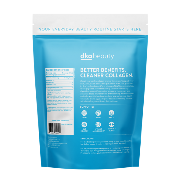 Collagen is a vital protein that supports healthy skin, joints, hair, nails, and digestion. Dr. Kellyann's collagen products helps to support skin elasticity, reduce wrinkles and joint pain, strengthens bones, and connective tissues. Regular collagen intake can also promote gut health, enhance muscle recovery, and boost overall vitality and resilience as your body’s natural collagen production declines with age.