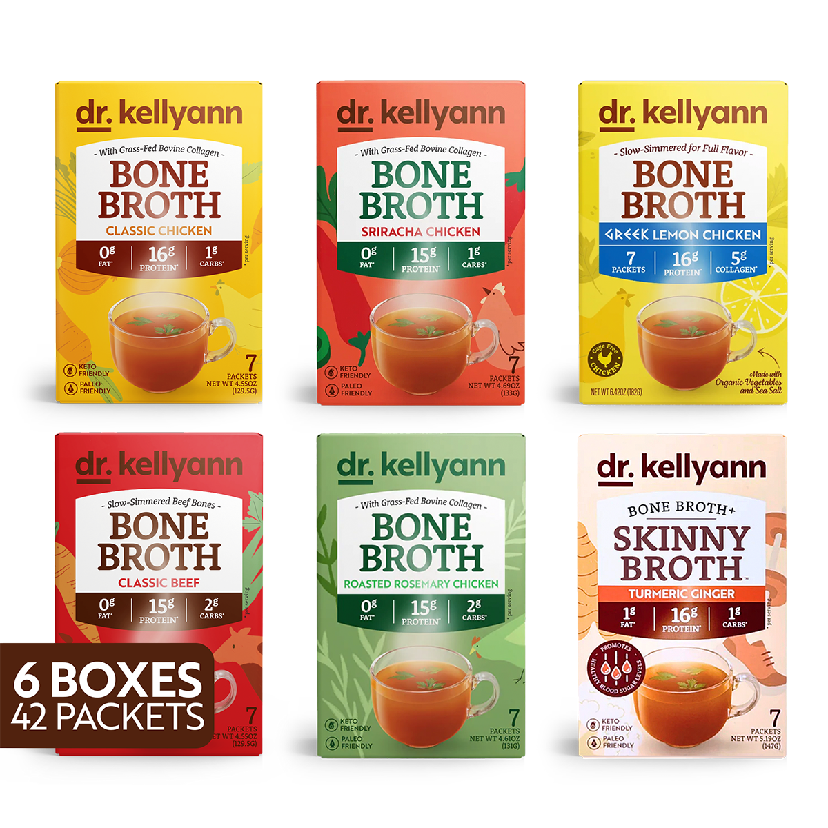 The 21-Day Bone Broth Diet Bundle – Classic Beef includes 42 packets (6 boxes) of Dr. Kellyann’s Classic Beef Bone Broth, formulated to support weight loss, boost energy, and nourish your body from the inside out. Each packet delivers 16g of protein and 2g of collagen per serving, providing the perfect balance of nutrition and flavor to fuel your 21-day transformation. Learn more about Dr. Kellyann’s wellness approach at Dr. Kellyann.com.