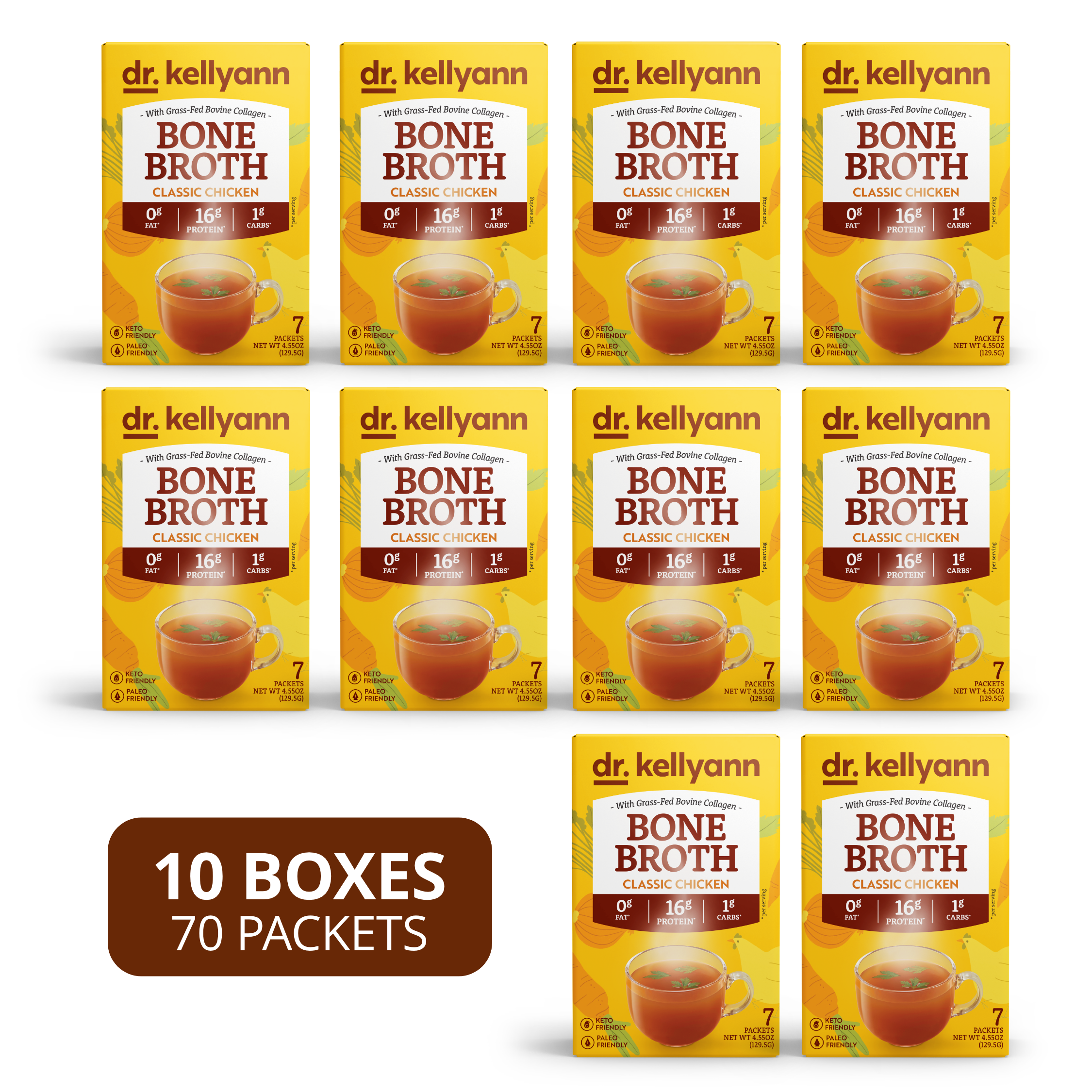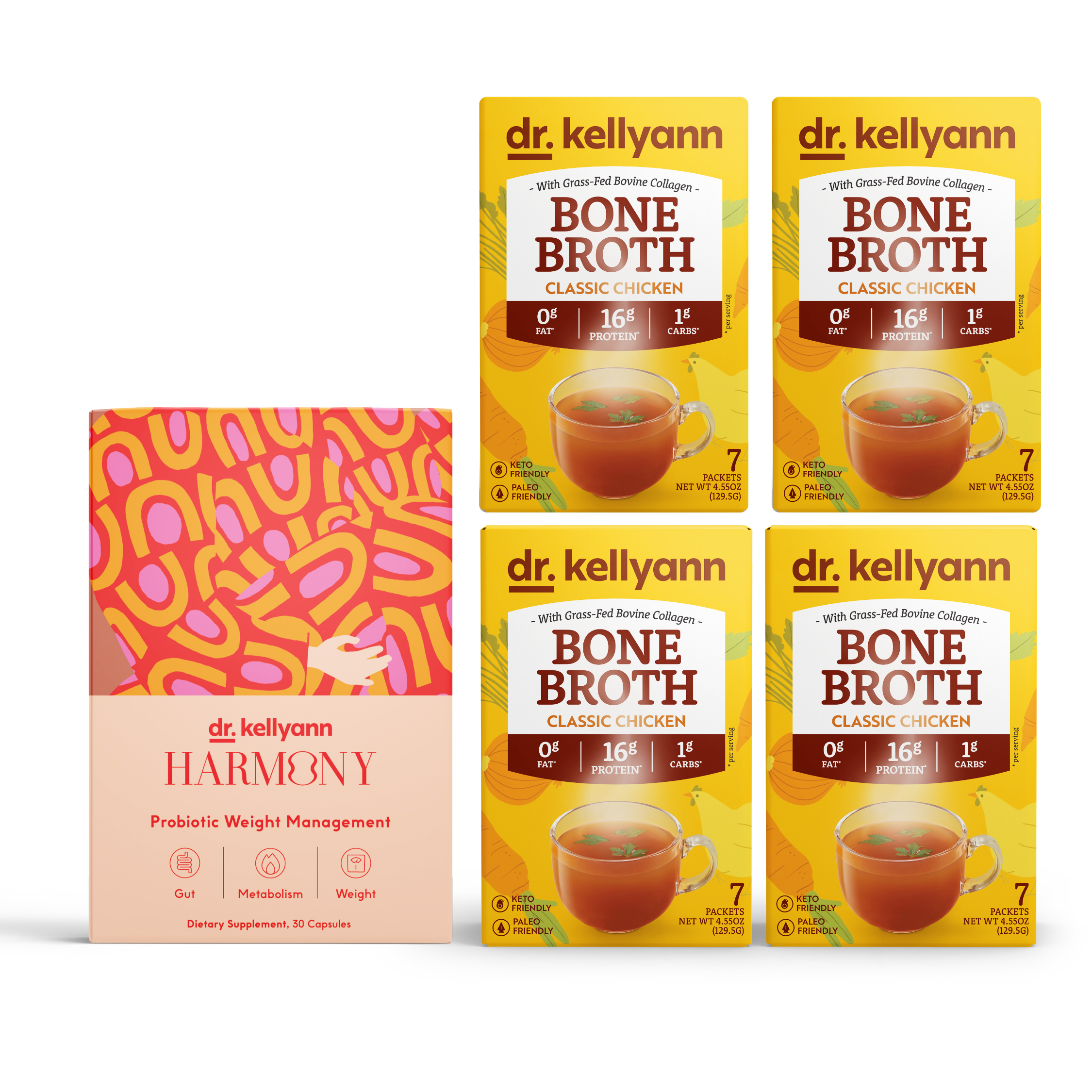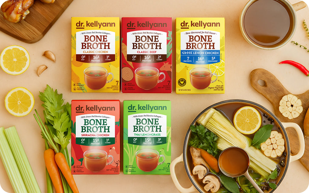 These bars use natural prebiotic fiber to promote smoother digestion and nourish the gut microbiome — while the collagen peptides help maintain skin elasticity and hydration. Together, they make a satisfying snack that supports your body’s natural wellness, aligning with the holistic nutrition philosophy behind Dr. Kellyann’s best-selling bone broths and shakes.